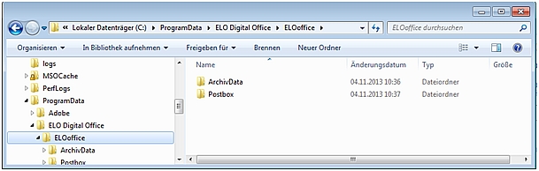 Um eine aktuelle Kopie der Archivstruktur, der Dokumente, der Anwender und der meisten Konfigurationseinstellungen zu erhalten, begeben Sie sich dazu zunächst über den Windows-Explorer zu Ihrem Systemverzeichnis (also dem Verzeichnis, in das die beiden ELOoffice-Ordner ArchivData und Postbox installiert wurden).