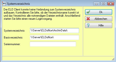 Wenn Sie bei der Anmeldung in ELOoffice eine Fehlermeldung erhalten, in der Sie aufgefordert werden, den Zugriffspfad zum Systemverzeichnis und zum Basisverzeichnis (in den Versionen bis einschließlich ELOoffice 7.0 wird hierfür die Bezeichnung „Postbox-Verzeichnis“ bzw. „Postfach“ verwendet) sowie die Seriennummer anzugeben, tragen Sie im Falle des Systemverzeichnisses den vollständigen Pfad, beim Basisverzeichnis bitte nur den Pfad bis oberhalb des gewünschten Verzeichnisses ein.