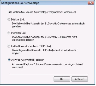 Ab Version 7.00.46 können nun auch komplette *.mht Dateien direkt nach ELO gespeichert werden. Im Internetexplorer besteht die Möglichkeit eine Internetseite zu archivieren (speichern unter …).Die Datei / das Format .mht beinhaltet dann in einer Datei sowohl das HTML wie auch alle Bilder. Der Browser stellt wiederum eine derart gespeicherte / archivierte Datei wieder als komplette Seite dar.