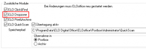 Im unteren Teil der Registerkarte befindet sich der Bereich Zusätzliche Module. Kontrollieren Sie hier, ob das Häkchen vor ELO Dropzone gesetzt ist und tragen das gegebenenfalls nach.