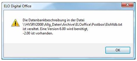 Prüfen Sie bitte in Ihrem Postboxverzeichnis – dieses finden Sie bei Standardinstallationen unter „…\ELOoffice\Postbox“ -, ob hier die Datei „EloMDb.txt“ vorhanden ist. Sollte sie nicht vorhanden sein, können Sie die gleichnamige Datei aus dem „ViewerPostbox“-Verzeichnis in das Postbox-Verzeichnis kopieren. Ist die Datei vorhanden, so ersetzen Sie sie durch die „EloMDb.txt“ des ViewerPostbox-Verzeichnisses.