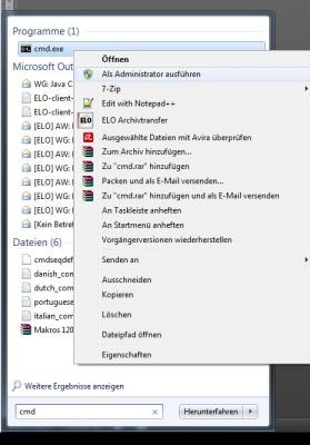 Windows-Startmenü -> Hier tippen sie „cmd“ ein und führen die [cmd.exe] aus.