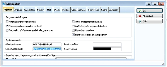 Im Tab „Allgemein“ sehen Sie das Eingabefeld „Systemverzeichnis:“ Nach der Installation ist an dieser Stelle, sofern Sie keinen eigenen Pfad angegeben haben, der Standardpfad eingetragen: