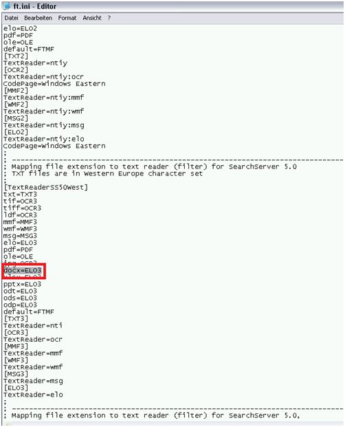Öffnen Sie die Datei „FT.ini“ (rechte Maustaste – Öffnen mit… Editor) und prüfen Sie ob der gewünschte Dateityp unterhalb von „[TextReaderSS50West]“ vorhanden ist.