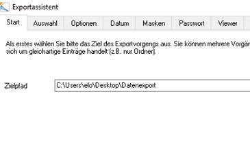 Wählen Sie dann im Reiter Start das Zielverzeichnis aus. Im vorliegenden Beispiel handelt sich hier um den gerade angelegten Ordner „Datenexport“.