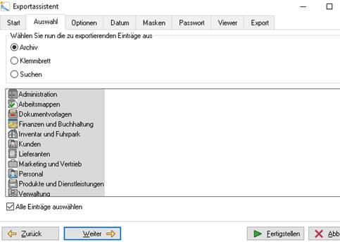 Unter dem Reiter Auswahl wählen Sie nun das Archiv und setzen einen Haken bei „Alle Einträge auswählen“.