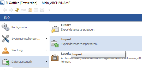 Klicken Sie im neuen Archiv auf ELO → Datenaustausch → Import.