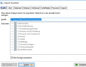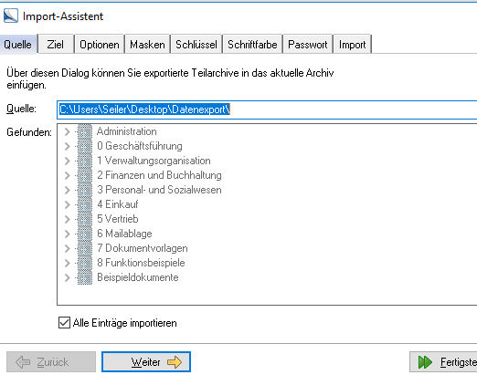 Unter dem Reiter Quelle können Sie wieder das Verzeichnis aus dem Datenexportsatz wählen. Bitte achten Sie darauf, dass hier der Haken bei „Alle Einträge importieren“ gesetzt ist. Daraufhin können Sie den Import fertigstellen.